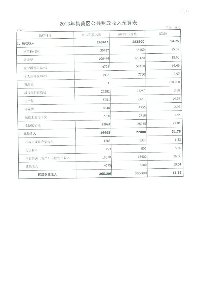 区级财政收入预算305800万元,比上年增长15.35%。区级财政收入加上上级补助22300万元,扣除上缴上级支出 14412万元和从城建税中计提水利建设基金3488万元后,可供安排财力310200万元。相应安排财政支出310200万元。收支对抵,全区当年财政预算收支平衡。