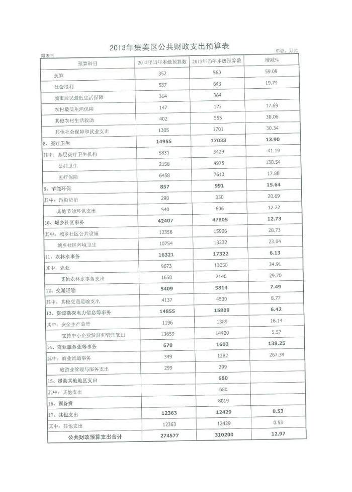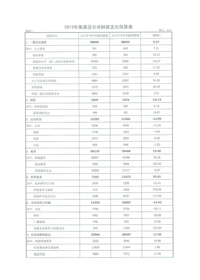 加大民生投入,推进社会建设,提高人民生活水平。加快发展社会事业。坚持教育投入优先,安排教育支出7.85 亿元,增加学前教育、基础教育投入,实施农村义务教育体系建设,促进教育更加均衡优质发展。完善医疗机构经费保障机制,确保公卫大楼投入使用,加快社区、农村卫生站(所)建设。安排文体支出1.07亿元,推进国家公共文化服务体系示范区创建,完善文体设施,丰富群众文体活动。建设公用停车场、公交候车亭,完善道路安全设施,提升公共交通服务。统筹城乡协调发展。健全社会保障体系,落实城乡居民救济救助政策,推进保障性安居工程建设。加大基层社区建设投入,提升社区服务管理功能。安排资金5亿元,推进城乡环境综合整治,完善城乡基础设施,支持小城镇建设。加强生态文明建设。落实区长环保责任书,争创国家级生态区。继续实施“四绿”工程[⑥],提高绿化覆盖率,建设国家森林城市,开展重点流域和海域综合整治,推进城乡生活垃圾、污水处理和环卫基础设施建设,美化人居环境,建设美丽集美。