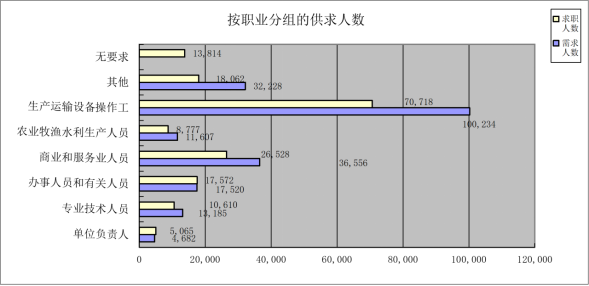 本季度职业供求总量为38.71万人次,较去年同期下降8.49%,较上季度上升0.15%。其中:岗位需求登记21.60万人次,较去年同期下降7.49%,较上季度上升1.60%;求职登记17.11万人次,较去年同期下降9.72%,较上季度下降1.62%。