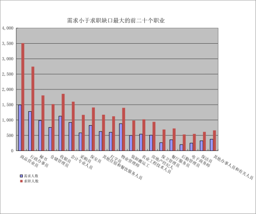 一是求大于供岗位(工种):“制鞋工”、“快递员”、“餐厅服务员”企业需求缺口分别是2630人次、2011人次、1319人次。二是供大于求岗位(工种):“商品营业员”、“行政办事员”、“秘书”的市场登记缺口分别是-2013人次、-1462人次、-819人次。
