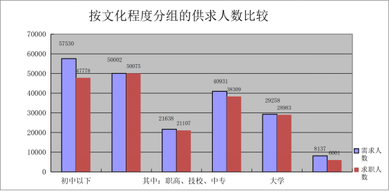 从文化程度上看,高中和初中以下学历的求职人员占求职总数的49.78%,整个人力资源供给市场学历仍相对较低,人力资源供给的素质结构需要进一步提升。