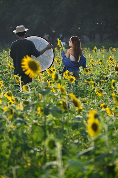 图一:市民在花海中拍照打卡。