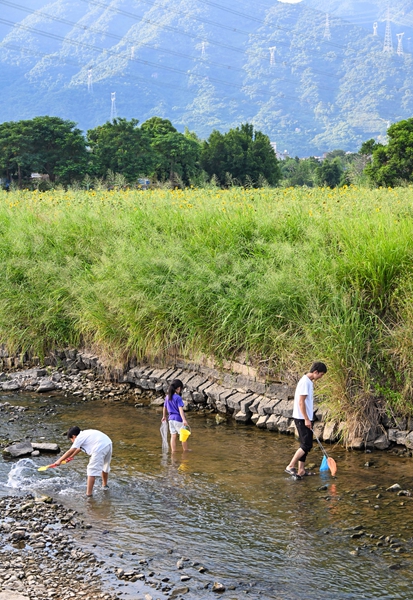 图三:花田旁就是田李溪,市民在溪水中玩耍。