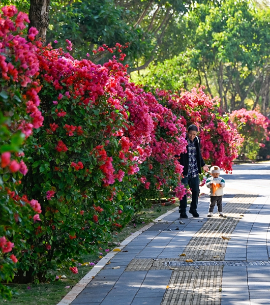 在同集路与集源路交叉口,“马年大吉、马运亨通”等马年主题形象憨态可掬,“2026集美福”标语醒目亮眼;三角梅与灌木花草错落有致,勾勒出灵动的景致。厦门北站北广场,三角梅藤蔓缠绕,“梦留厦、心留厦、爱留厦”的标识掩映于绿荫之中,温情脉脉。滨海西大道、集杏海堤、西滨路沿线等处,绿植与道路相映成趣,精致的街角绿地、四季常开的花境,形成一路一景的独特风情。