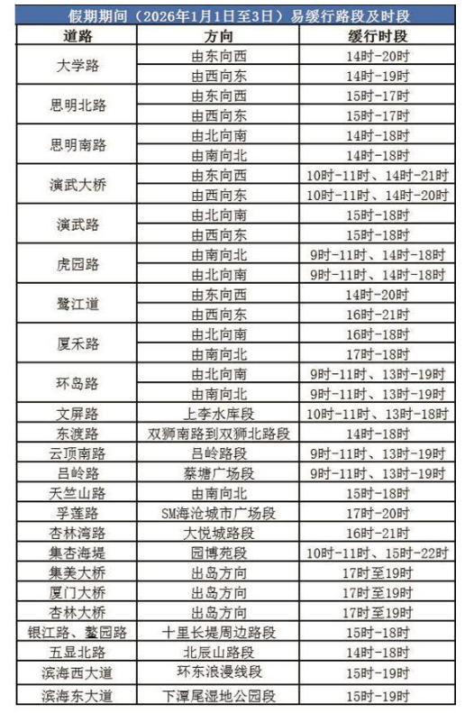 假期返程车流主要在2026年1月3日15时至21时之间,主要车辆聚集会出现在高速公路出口、厦门大桥、海沧大桥、翔安隧道、翔安大桥进岛方向,及部分景区商圈周边路段。厦门北站周边道路接驳车流也将有所增加,车辆聚集情况可能会持续至23时许。当天厦门体育中心将举办梁静茹演唱会,演唱会观众车流与节后返程车流叠加,也将对进出岛“五桥两隧”和演唱会周边道路交通带来一定影响,17时至19时期间车流将一定程度上高于其他小长假。