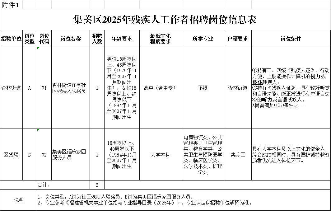 (二)具体招聘岗位及条件信息请查看《集美区2025年残疾人工作者招聘岗位信息表》(附件1)。