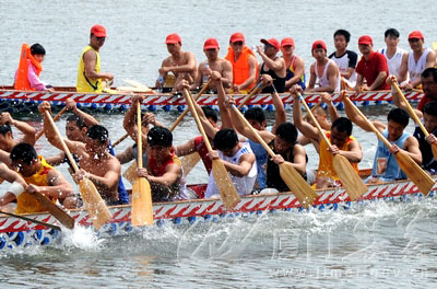 ▲4月30日,集美龙舟池上一支支龙舟队在紧张训练。为了夺得今年两岸龙舟文化节的好成绩,集美大学、华侨大学龙舟队早准备早训练。(王文津/摄)