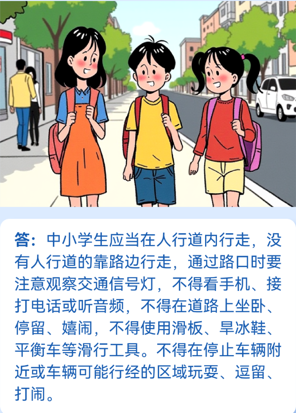 中小学生应当在人行道内行走,没有人行道的靠路边行走,通过路口时要注意观察交通信号灯,不得看手机、接打电话或听音频,不得在道路上坐卧停留、嬉闹,不得使用滑板、旱冰鞋、平衡车等滑行工具。不得在停止车辆附近或车辆可能行经的区域玩耍、逗留、打闹。