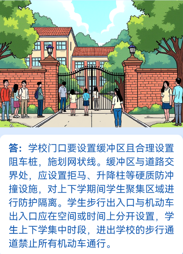 学校门口要设置缓冲区且合理设置阻车桩,施划网状线。缓冲区与道路交界处,应设置拒马、升降柱等硬质防冲撞设施,对上下学期间学生聚集区域进行防护隔离。学生步行出入口与机动车出入口应在空间或时间上分开设置,学生上下学集中时段,进出学校的步行通道禁止所有机动车通行。