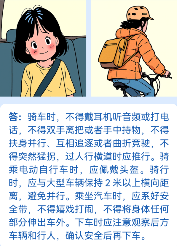 骑车时,不得戴耳机听音频或打电话,不得双手离把或者手中持物,不得。扶身并行、互相追逐或者曲折竞驶,不得突然猛拐,过人行横道时应推行。骑乘电动自行车时,应佩戴头盔。骑行时,应与大型车辆保持2米以上横向距离,避免并行。乘坐汽车时,应系好安全带,不得嬉戏打闹,不得将身体任何部分伸出车外。下车时应注意观察后方车辆和行人,确认安全后再下车。