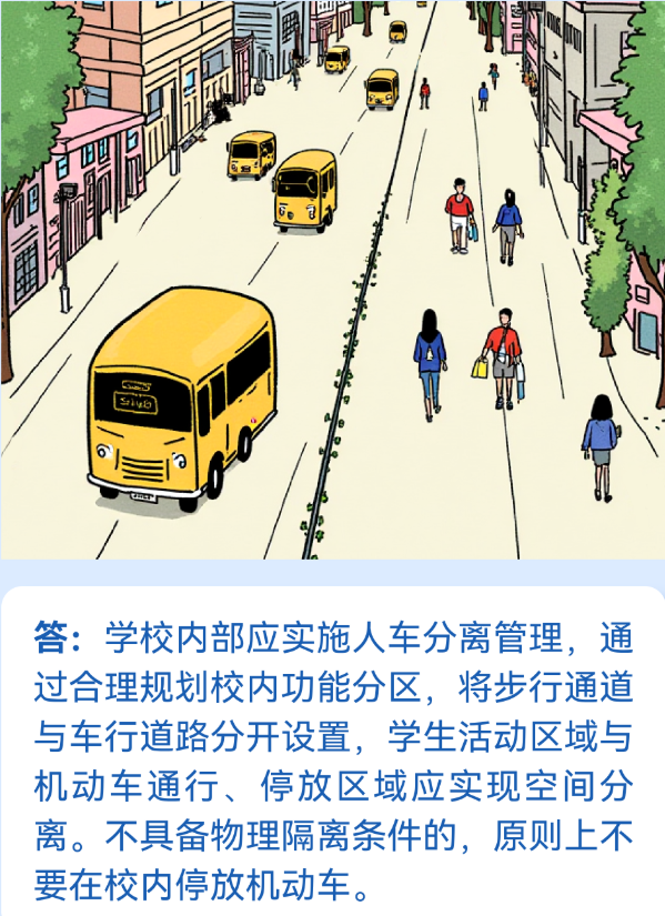 学校内部应实施人车分离管理,通过合理规划校内功能分区,将步行通道与车行道路分开设置,学生活动区域与机动车通行、停放区域应实现空间分离。不具备物理隔离条件的,原则上不要在校内停放机动车。