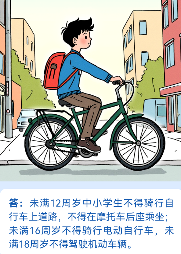 未满12周岁中小学生不得骑行自行车上道路,不得在摩托车后座乘坐;未满16周岁不得骑行电动自行车,未满18周岁不得驾驶机动车辆。