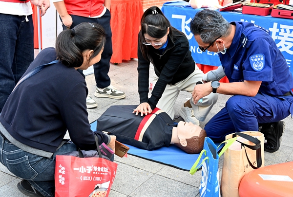 图二:市民现场体验急救技能。(吴觅亮 摄)